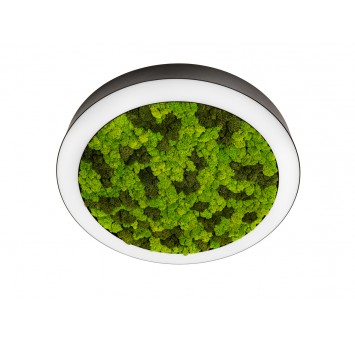 Светильник представляет собой кольцо из профиля шириной 50 мм и высотой 75 мм, различного диаметра. Дает яркий ровный свет без пульсации. Температура света на выбор, 3000К или 4000К. Так же возможна установка источников света с изменяемой цветовой температурой либо White+RGB. Корпус выполнен из алюминиевого профиля, окрашенного в матовый белый или черный цвет. Возможен накладной и подвесной вариант монтажа. По периметру светильника установлена LED лента, которая скрыта рассеивателем из поликарбоната. В качестве элемента декора используется стабилизированный мох. Блок питания установлен в корпус светильника. Возможна установка диммируемого драйвера DIM 1-10 – по запросу.